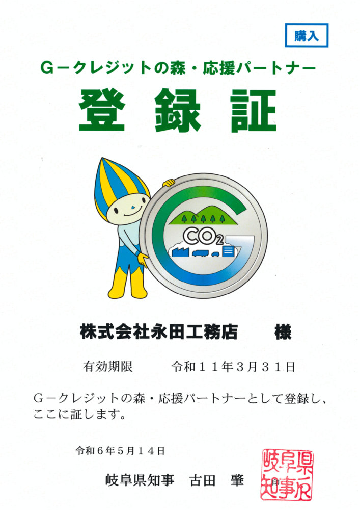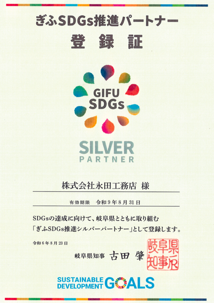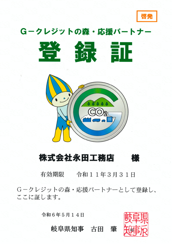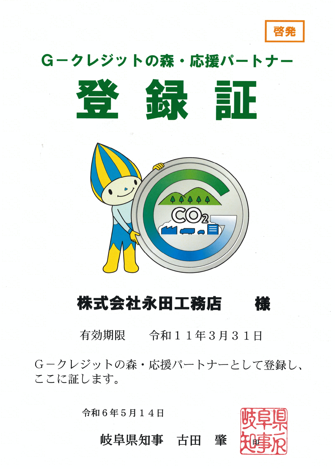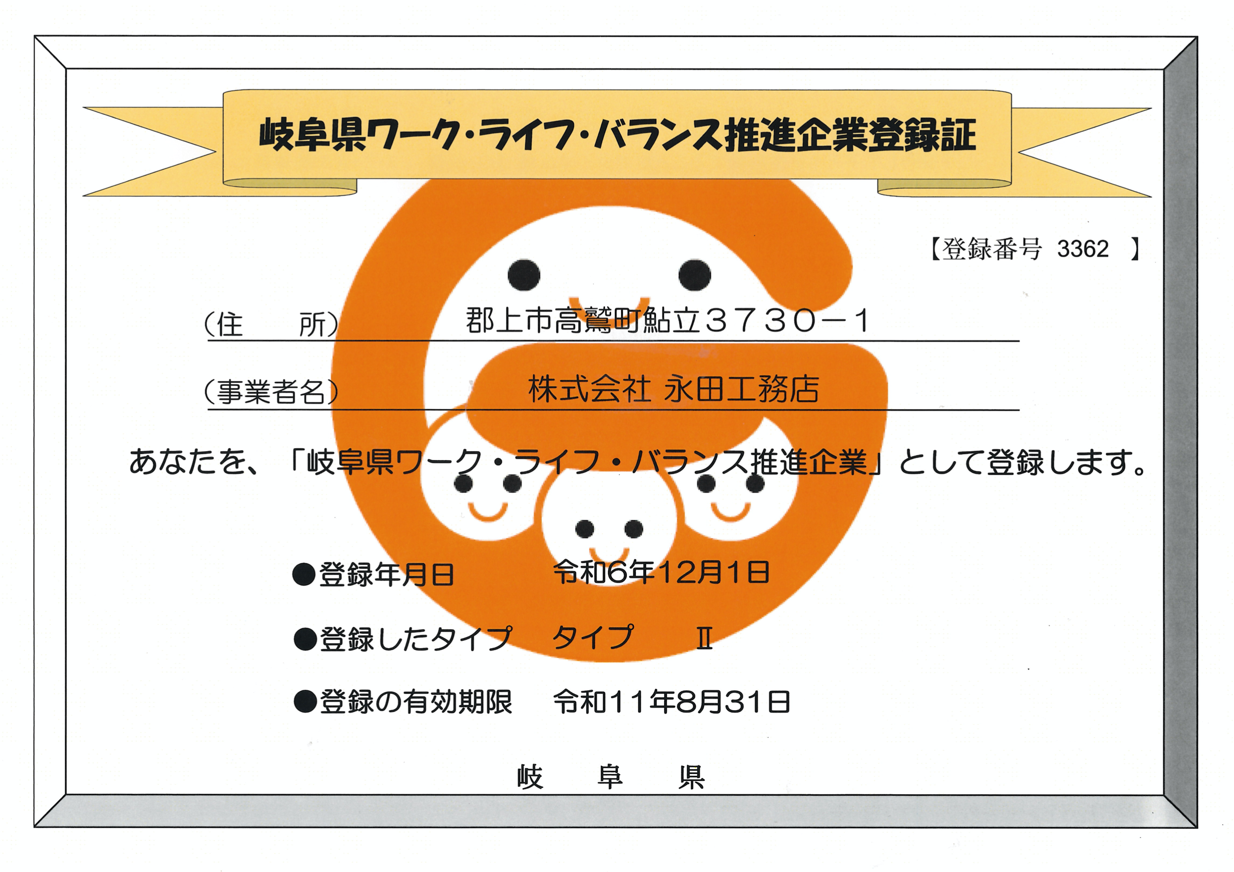 | 営業許可番号 | 岐阜県知事(特-2) 第10566号 (土木 とび・土工 舗装 石 水道施設) 岐阜県知事(般-2) 第10566号 (大工) |