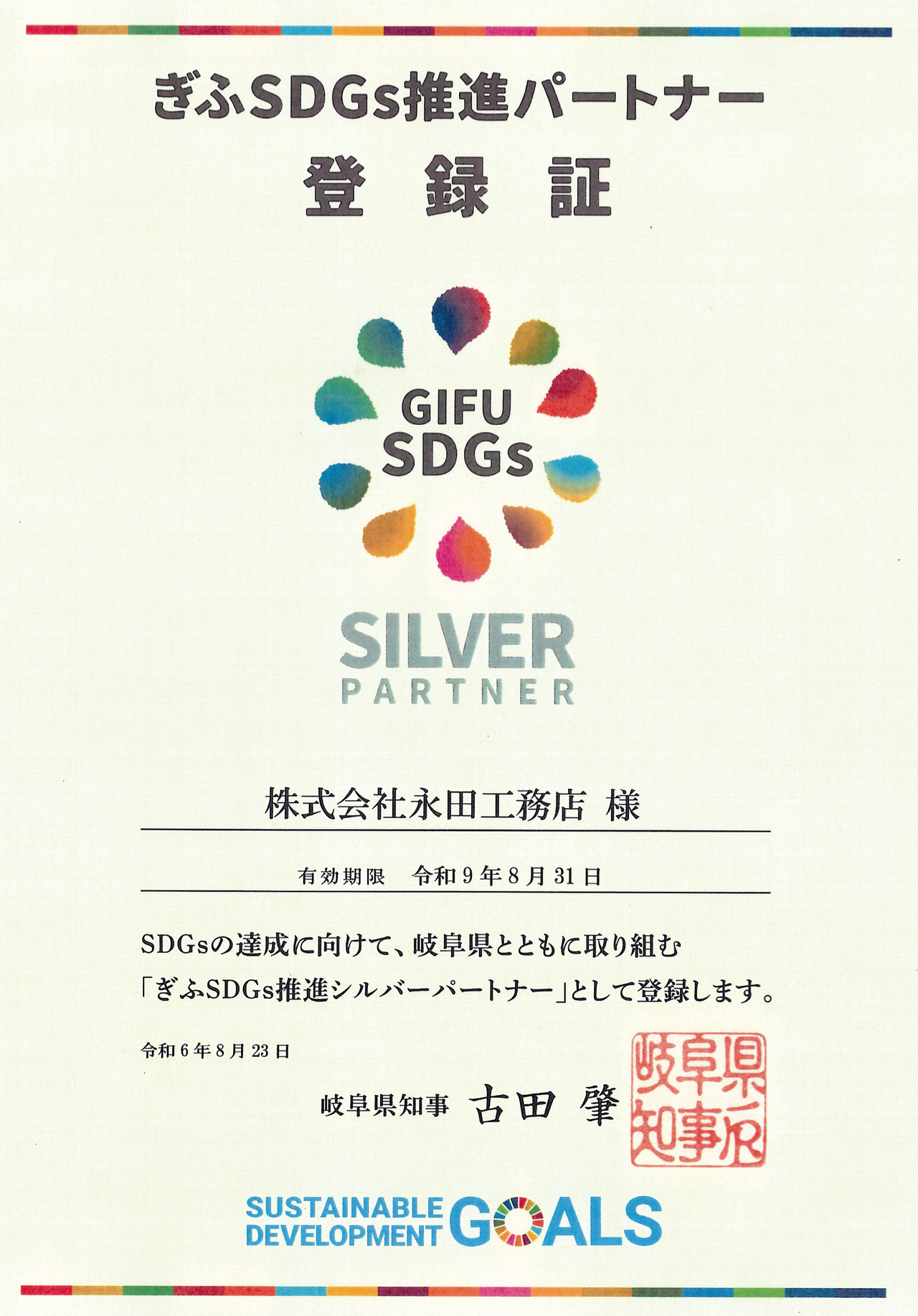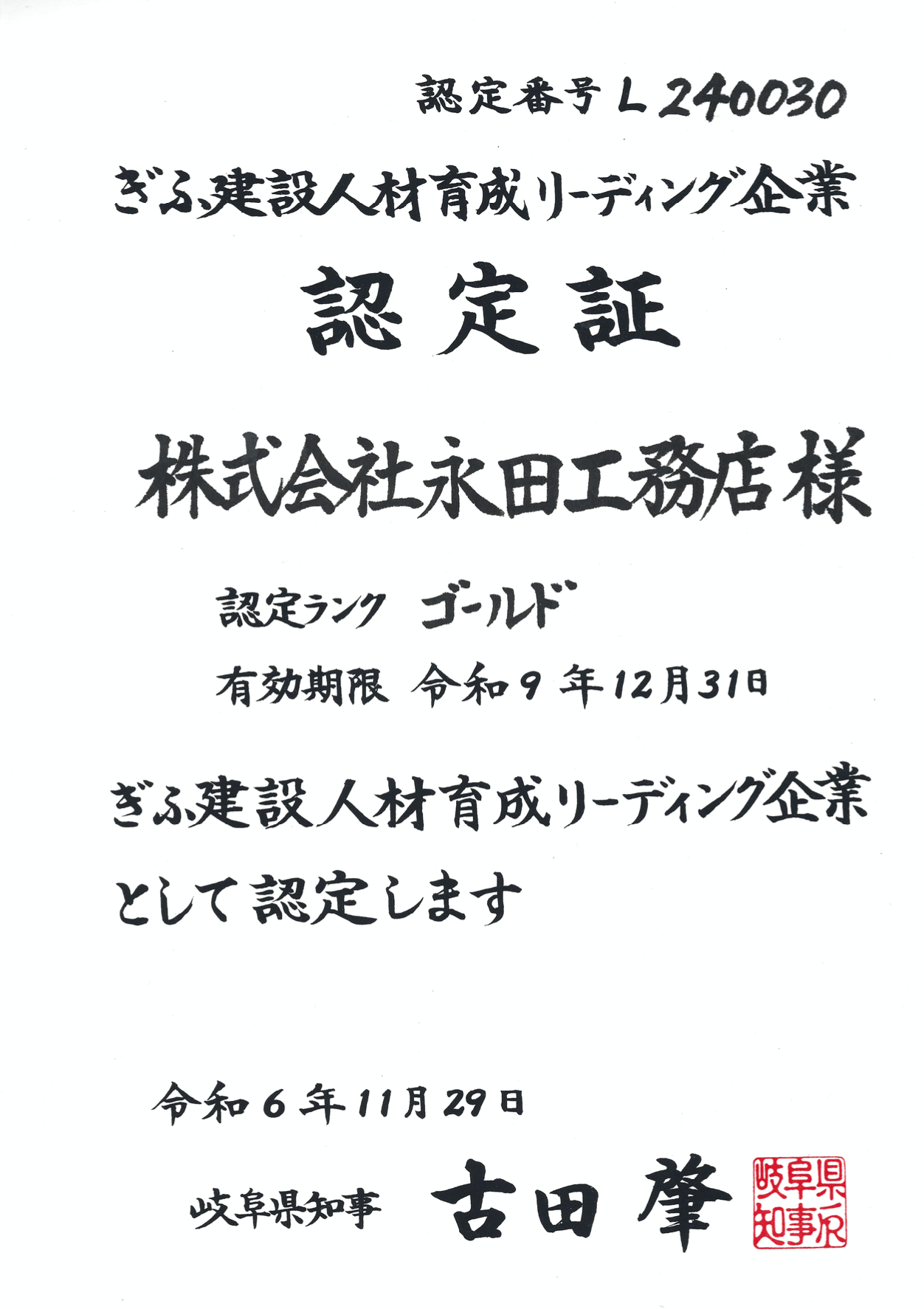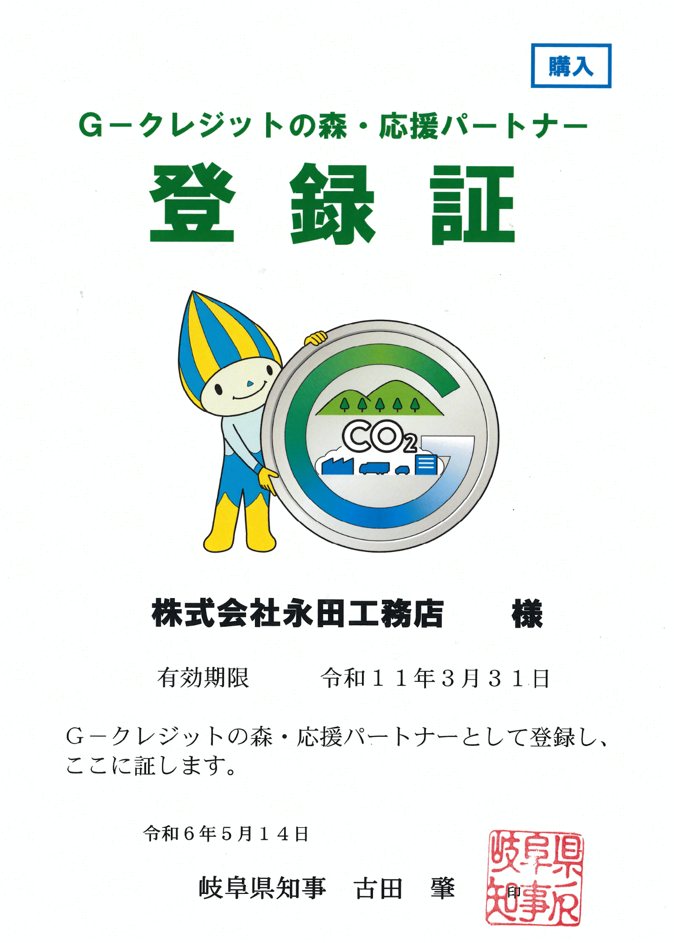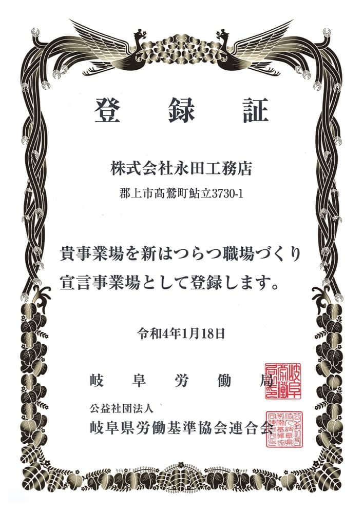 | 営業許可番号 | 岐阜県知事(特-2) 第10566号 (土木 とび・土工 舗装 石 水道施設) 岐阜県知事(般-2) 第10566号 (大工) |